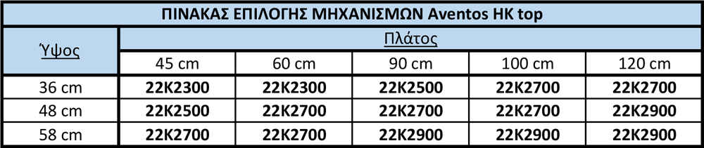 Παρακαλώ συμβουλετείτε τον παρακάτω πίνακα για να δείτε αν σας ταιριάζει ο μηχανισμός AVENTOS HS Top.