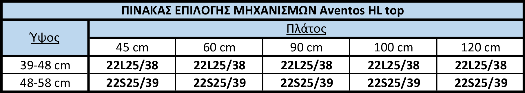 Παρακαλώ συμβουλετείτε τον παρακάτω πίνακα για να δείτε αν σας ταιριάζει ο μηχανισμός AVENTOS HS Top.
