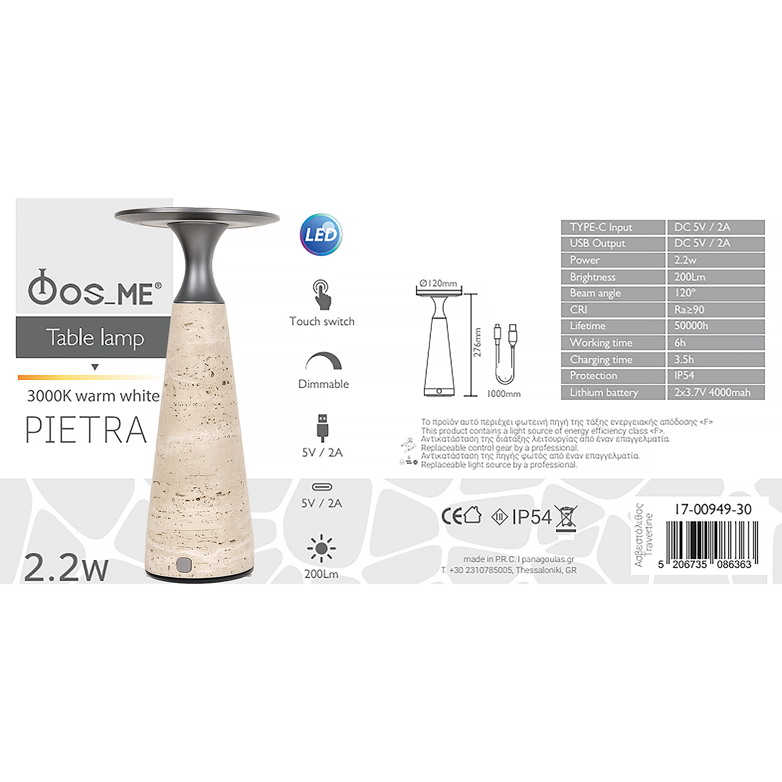 Επιτραπέζιο Πορτατίφ Led Επαναφορτιζόμενο 2.2W 3000K Warm White 200LM Dimmable PIETRA ΠΟΡΟΛΙΘΟΣ Ø120x276mm FosMe 17-00949-30